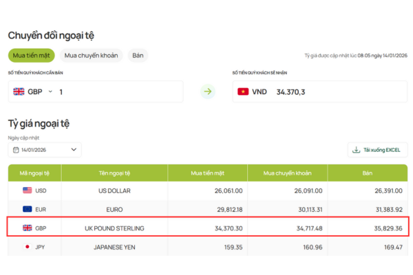 Theo thông tin cập nhật sáng ngày 14/01/2026, tỷ giá bảng Anh hôm nay tại Vietcombank được niêm yết như sau: